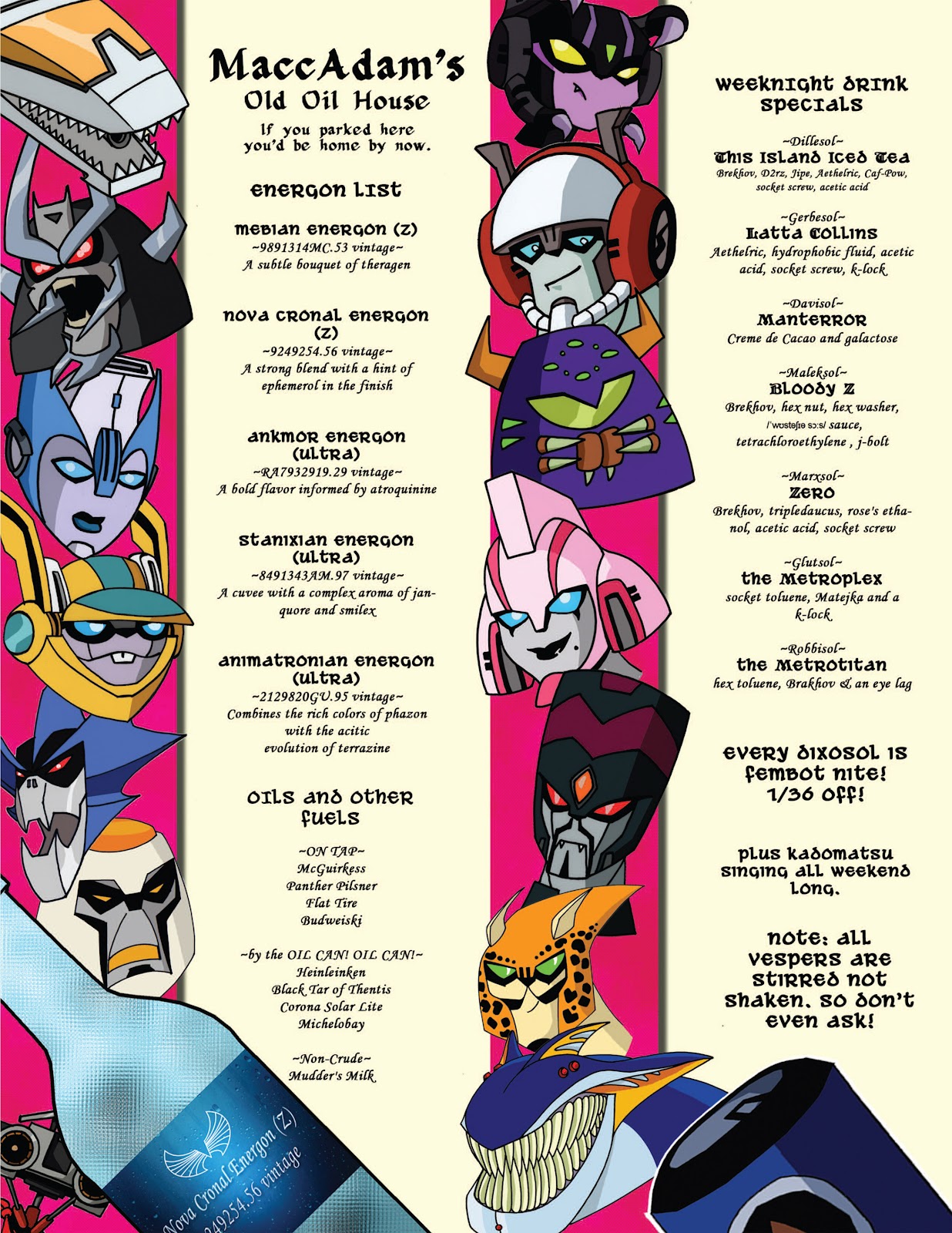 As Marvel Comics also touched on feelings, mortality, and birth and rebirth. Grimlock loses the Dinobots and he carries their bodies to a relic that would supposedly make him powerful enough to reawaken them. And it's the first time that Grimlock really gets meaningful development. Adding the concept of having a spark, I don't think, harms that. When someone starts bringing up Empurata, it's an issue. Pic related is from Alspark Almanac Vol 2 with Maccadam's menu. And it's little things like this that I think flesh out the world in a way that's not too intrusive. As in G1, they do make allusions to having their own food. It's just made of oil and mineral