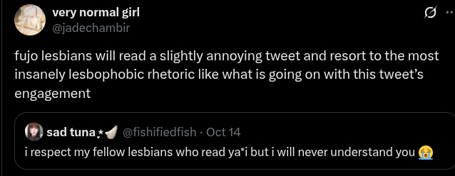 >>8867>old woman yuri and the "women" are barely 20I have this same gripe with 'old man yaoi' and one of the "old men" is barely 30 but that aside, the "fujos" who exclusively only do transbend/genderbend into yuri or trans ships I feel like they have that internalized shame of being a fujo, that being a fujo is stupid and cringe and fetishizing men while also having the tumblr activism mentality of "stop centering your life around men (and start liking women)"