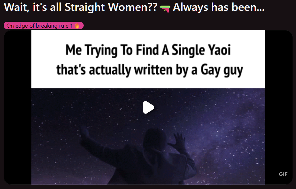 >>11269>reverse image search takes me to one of the circlejerk subs>generalizes yaoi as "heteronormative" so much it's become noise at this pointAre tifs just… stuck in 2016?