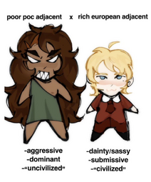 >>12592So much this. There's this annoying tendency in western fandom of taking ships who are canonically poor kid/rich kid and changing the skintones so they can call the poor kid PoC. I'm sick of people doing it to Kei and Iori from Charisma because Iori is the one with the most suggestions his family could be foreign, and Kei is the "uncivilized" vandal who smashes things, starts fights, and gets called monkey all of the time. They erase the Chinese stuff from Iori's identity because they consider it orientalism then turn Kei black and continue to call him a violent monkey. He has tanner skin in canon which is typical Japanese stereotyping at work, but between him and Iori it just shows that he was an outdoor kid and Iori has always been confined indoors.