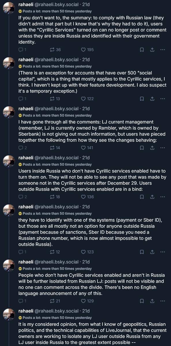 If you anything you cared about is still on livejournal you'd better save it (kink memes, old conversations). The tl;dr of the situation is that it's in a tenuous state of access by non-Russians and while it probably won't amount to anything (nothing ever happens) I thought I'd post here as a reminder.