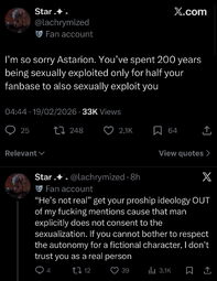 It does seem like antis have won in polarizing fandom. Everything is about morality and talking about how bad your blorbos are or making disclaimers about how you don't condone something in real life and less about understanding that we're all adults who shouldn't need our hands held about fiction.