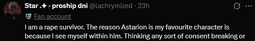 >>12065Not them saying this about ASTARION of all characters, the designated yume bait, the y/n reader insert favorite, the female romance character that everyone was thirsting on before even release kek