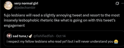 >>10794>>10803I've never seen an actual lesbian into yuri, they just had waifus who they were obsessed with and that was it basically.