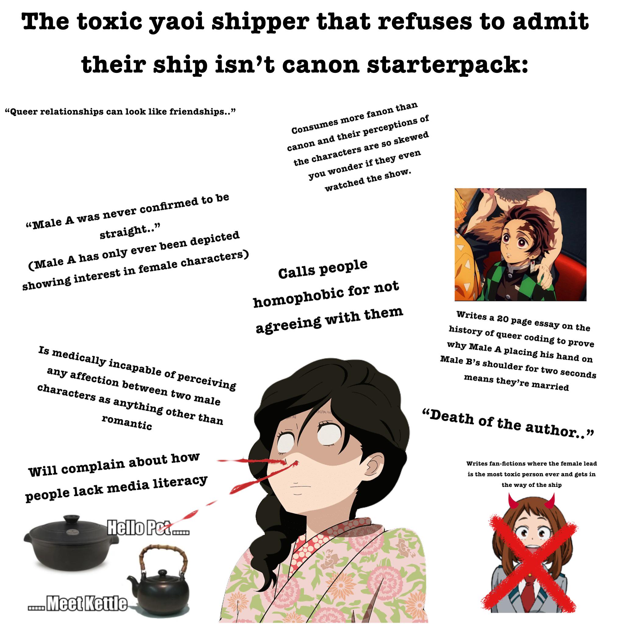 >>10716Someone explain to me how headcanoning a male character as gay is "misogynistic". Is headcanoning a female character as a lesbian misandrist too? You just know these people only participate in shounenshit fandoms where the female characters are either scantily clad sexy babes written for horny 14-year old boys or the girl next door with the personality of a wet rag both created by the male author and then whine about them not being appreciated enough.