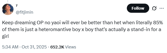 It’s easier to avoid that realisation altogether and only interact with yumes who ship themselves with other fictional men.