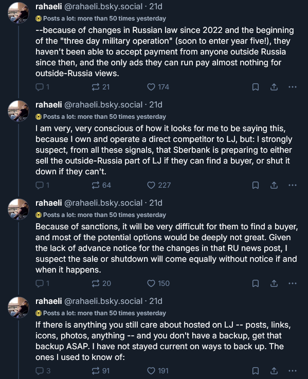 If you anything you cared about is still on livejournal you'd better save it (kink memes, old conversations). The tl;dr of the situation is that it's in a tenuous state of access by non-Russians and while it probably won't amount to anything (nothing ever happens) I thought I'd post here as a reminder.