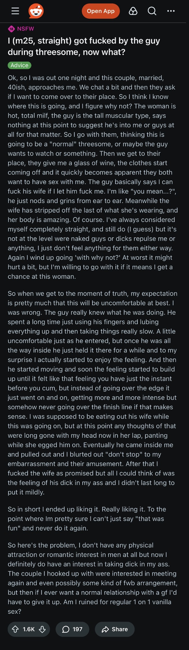 can't find it but there was one about a guy losing his virginity to a top on grindr so he could study the guys moves for when he had sex with a girl.