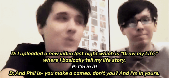 anyways i was one of the deranged schizo dan and phil fujos in middle school. looking back their content wasnt even that good but the gay shit that would pop up in their videos from time to time would make up for it. all of the batshit insane AUs that people would come up with for their fics and art were so OOC that it was kind of hilarious but i liked it anyways. even some of the biggest artists in the phandom at the time shamelessly drew and posted porn of them on their tumblr blogs